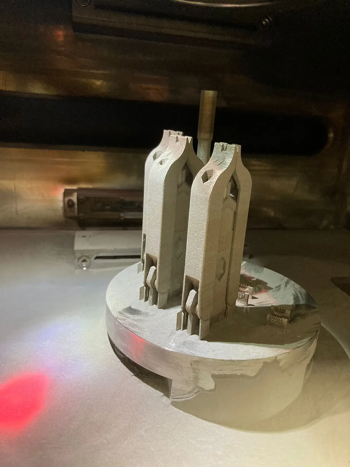 “We zijn in september begonnen met een projectgroep om ons als docenten de techniek van het 3d metaalprinten helemaal eigen te maken”, vervolgt Bob. “De mogelijkheden zijn onbegrensd, maar je moet wel weten wat je doet. Het maken van een ontwerp bijvoorbeeld verloopt heel anders dan bij de gebruikelijke productiemethoden. Dat is ook voor ons als docenten een ontdekkingsreis. Daarbij komt dat rvs een hele fijne en daardoor gevaarlijke stof is. Daarom moeten we bij gebruik een gelaatsmasker met filters op en een overall.”