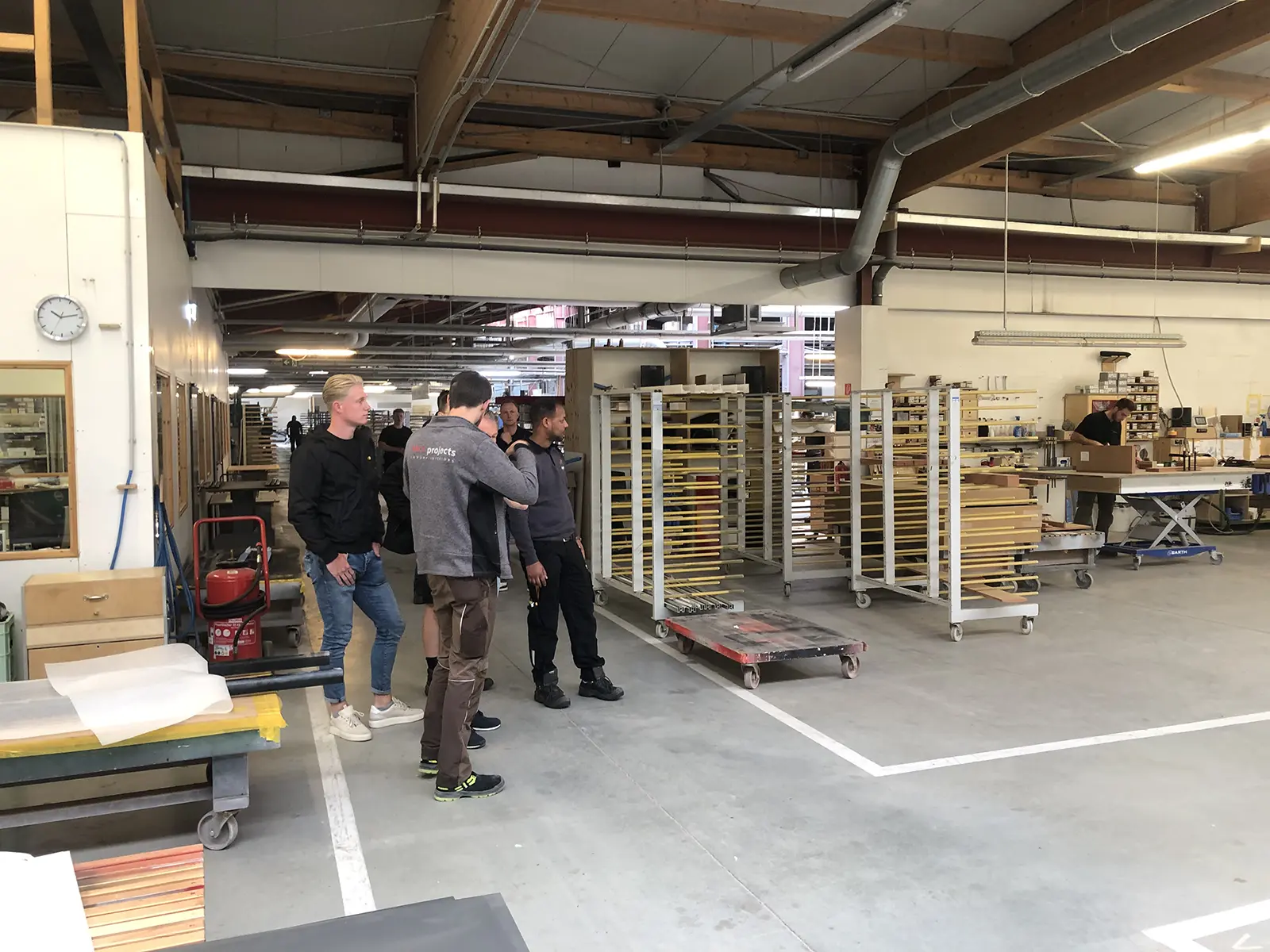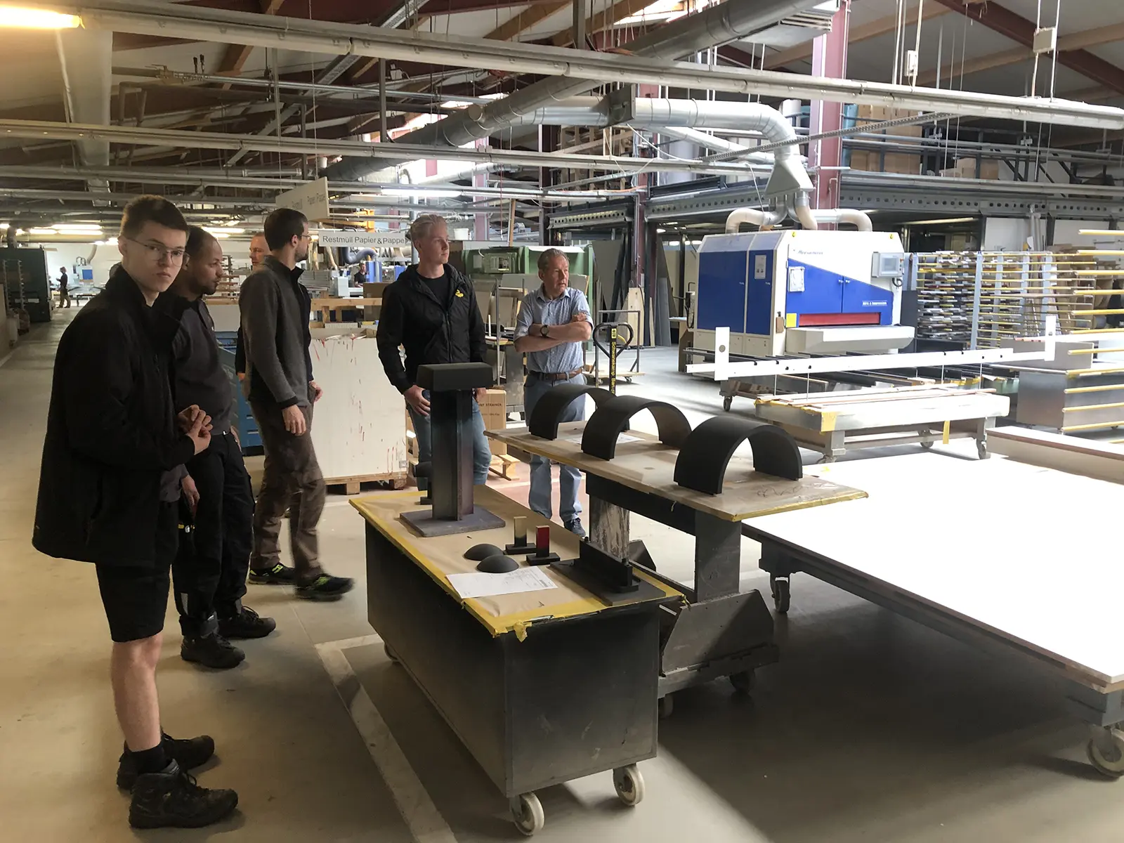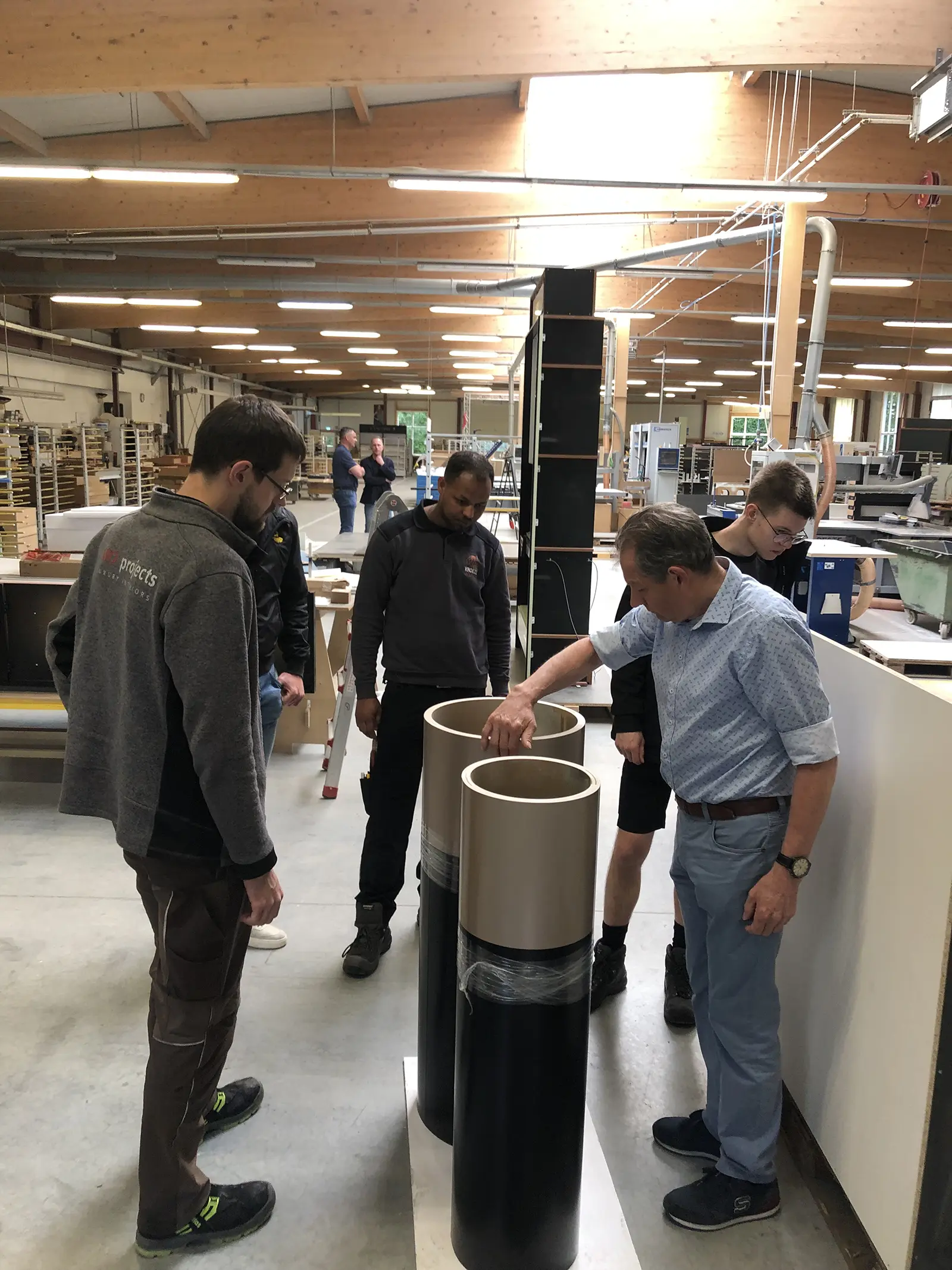 Die ausführliche Führung gab einen Einblick hinter die Kulissen von MOprojects. Auch die Büros, in denen die Arbeitsvorbereitung, die Verwaltung, das Vertriebs- und Marketingteam tätig sind, wurden besichtigt. Anschließend folgten die Produktionsabteilungen mit verschiedenen Arten von Maschinen, von traditionellen Holzbearbeitungsmaschinen bis hin zu CNC-gesteuerten Produktionsmaschinen und industriellen Lackieranlagen, um die Möbel hochglanzlackiert zu bekommen.
