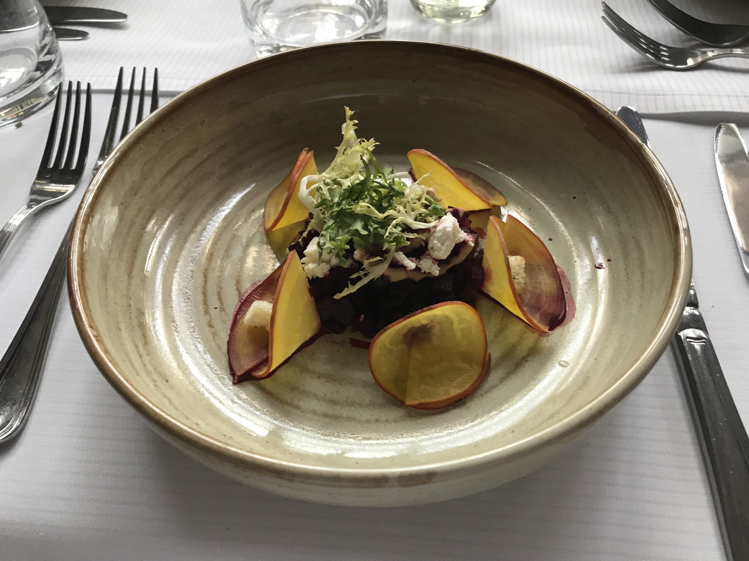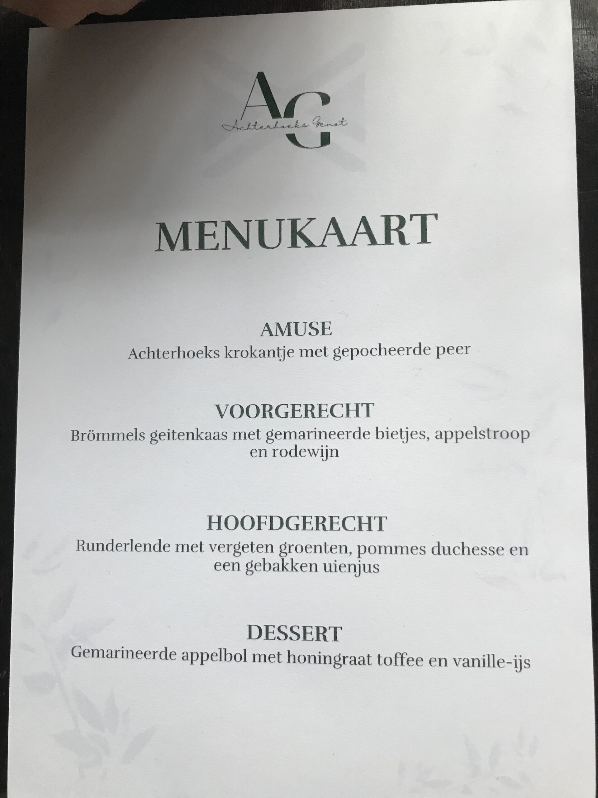 Vorab servierten die Auszubildenden Krüstchen mit pikanter Birne. Als Vorspeise gab es regionalen Ziegenkäse mit marinierter Roter Bete. Die Hauptspeise bestand aus Rinderlende mit Gemüse und Zwiebelsauce. Als Nachspeise gab einen gebackenen Apfel mit Honigtoffee und Vanilleeis. Zusätzlich gab es ein regionales Bier, gebraut mit Getreide aus der Region Achterhoek.