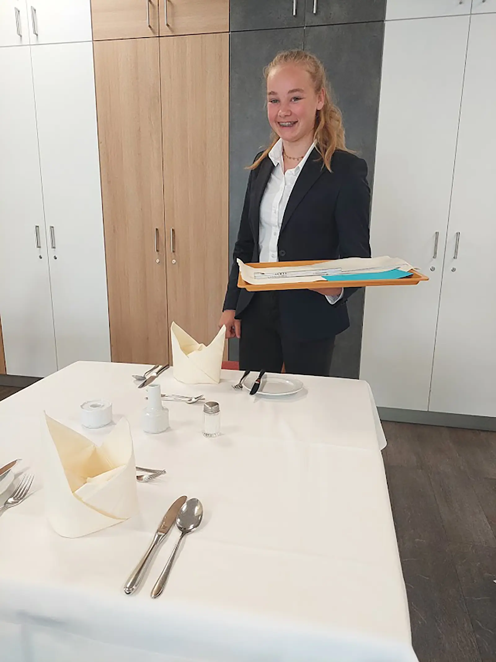 De workshops vonden plaats in het kader van het gastronomische partnerschap. Bij het professioneel indekken van de tafels kwamen onder meer ‘Zollstöcke’ te pas. Daarna konden de studenten met dank aan Mailyn Düsterhues en haar collega’s Anna Postma en Lennart Buthmann het viersterrenhotel Vienna House Remarque Osnabrück verkennen. Een hotelexcursie met een rondleiding verzorgd door ‘Azubi’ (horecastudent) Steen.