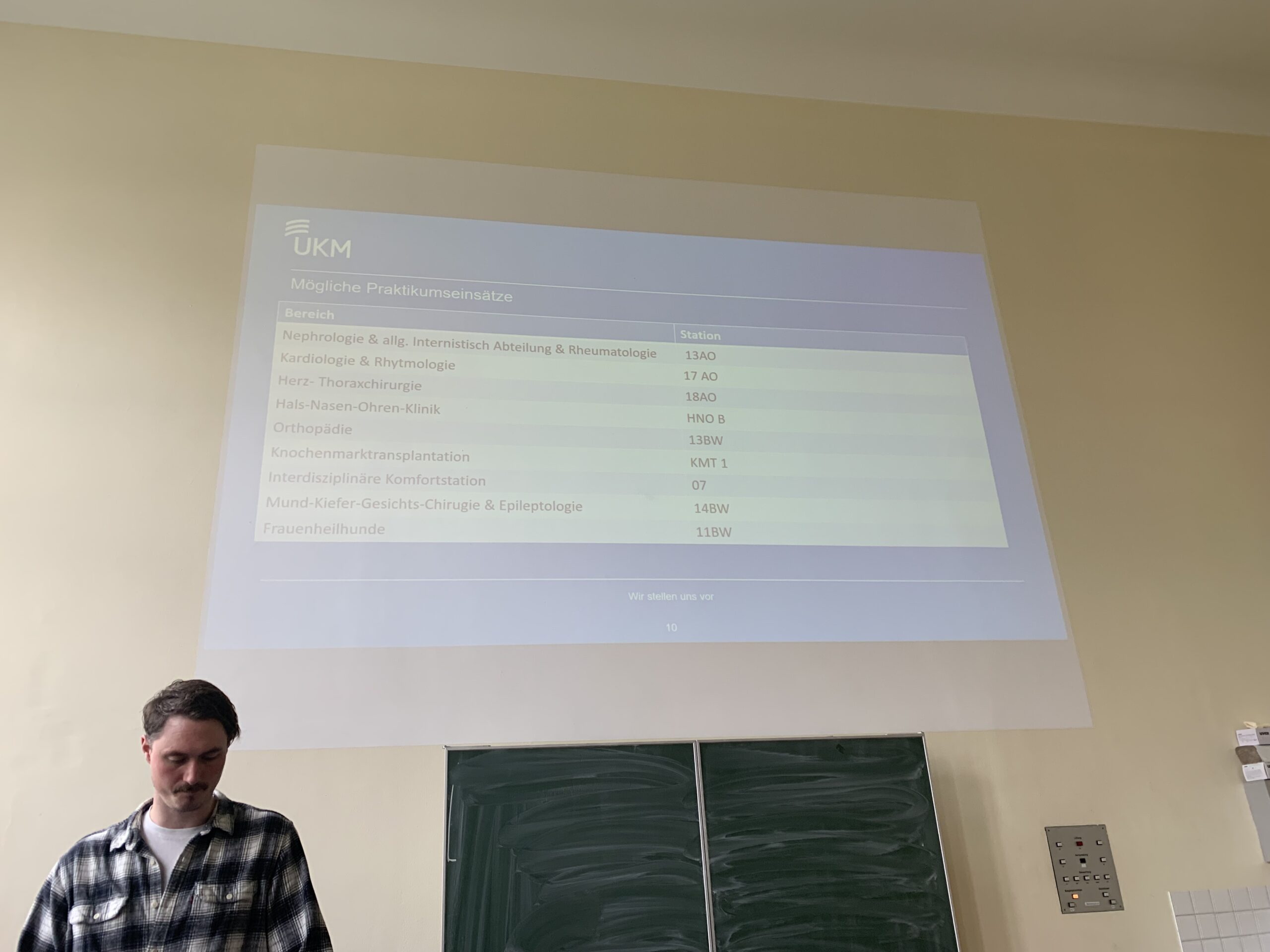 De 23 meegereisde studenten en wij vier begeleiders kregen eerst een algemene presentatie over het ziekenhuis. Daarvoor mochten we in een van de collegezalen van de interne school plaatsnemen. We kregen een beeld van de ziekenhuisstructuur, de afdelingen, het beddenaantal en de enorme omvang van de instelling, die in 29 gebouwen verspreid door Münster gehuisvest is.